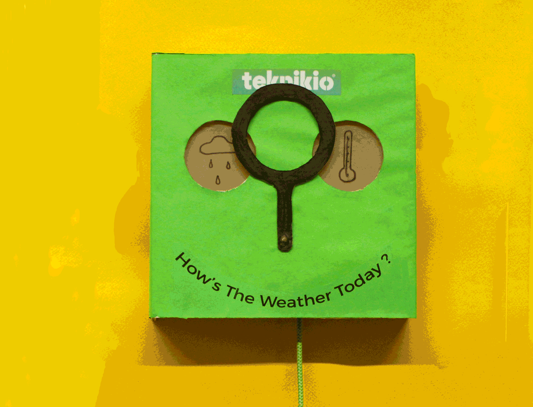 This is a weather station that shows the chance of rain and the temperature. Turning the magnifier rotates the Bluebird board inside, whose orientation can be programmed to determine how and which information to display. For example, program the rate at which the blue light blinks to show how likely it will rain. Detailed Instruction Here.