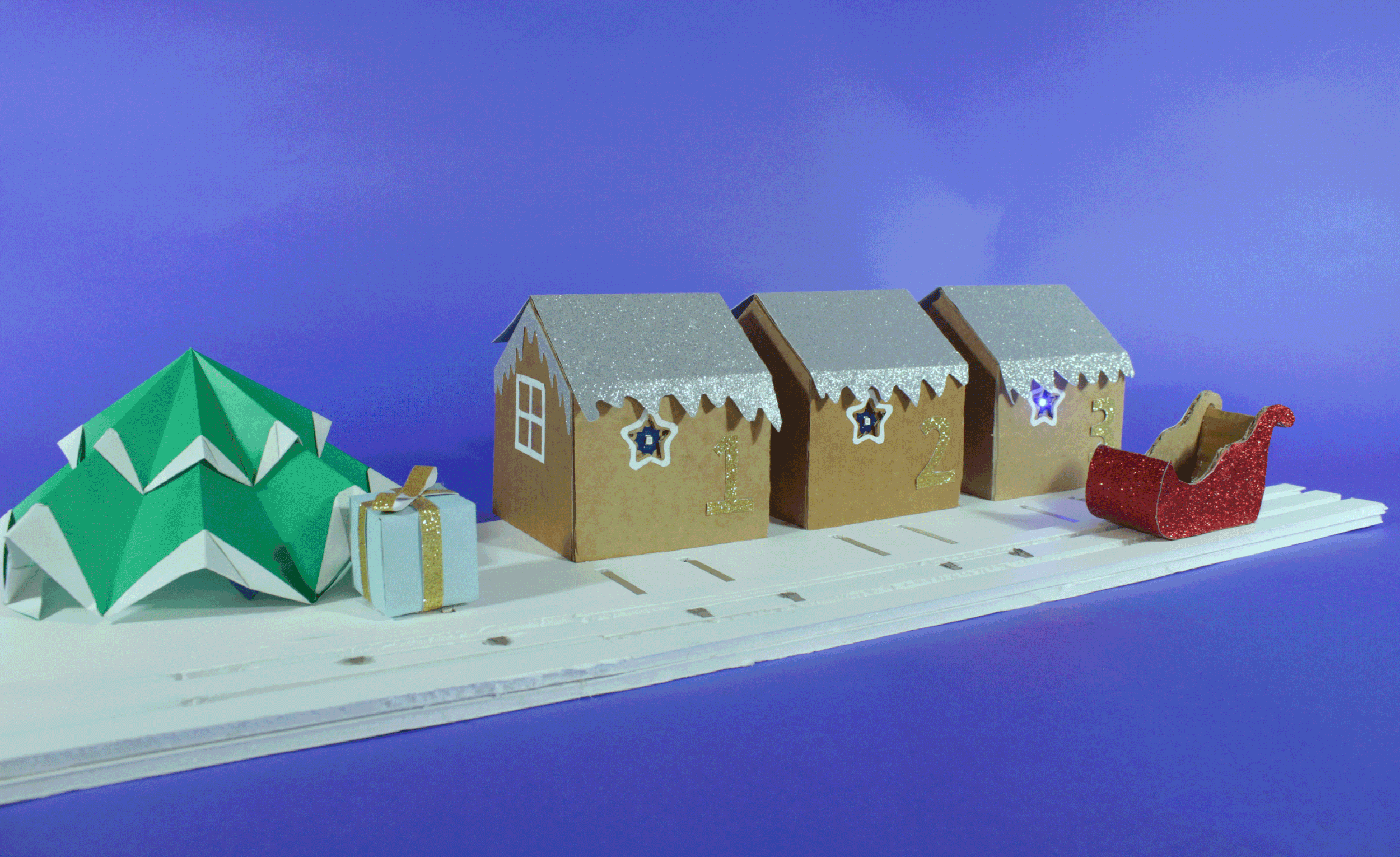 Make this fun holiday countdown calendar while learn about simple circuitry. The conductive at the bottom of the sled works as a movable piece that completes each one of the three circuits as you move it along the track.